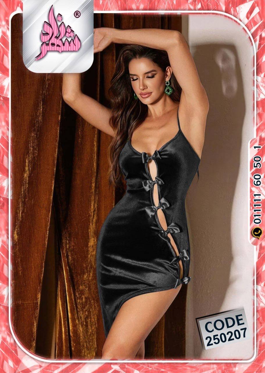 يتميز بقصّة قصيرة جريئة تبرز جمال القوام، مع فتحات جانبية مزينة بربطات أنيقة تضيف لمسة من الإغراء والرقي.
