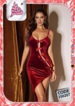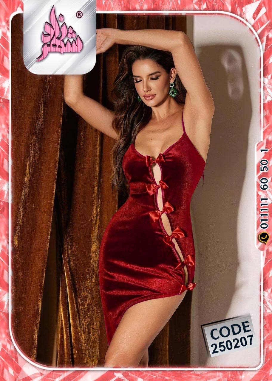يتميز بقصّة قصيرة جريئة تبرز جمال القوام، مع فتحة أمامية مزينة بربطات حريرية تضيف لمسة من الدلال والرقي.